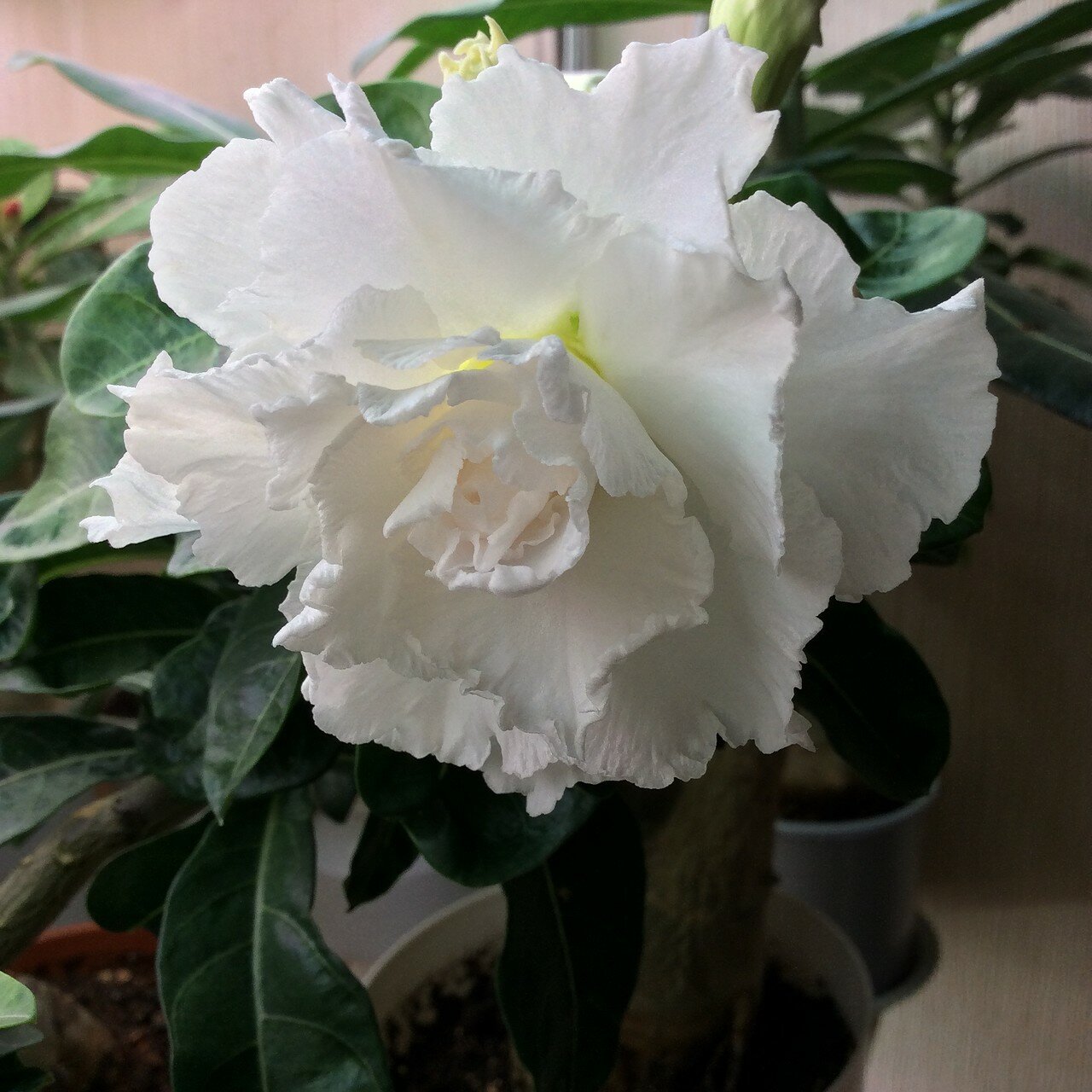 Адениум или роза пустыни, относится к семейству Кутровых и к древесным суккулентам – растениям, которые накапливают воду в «частях тела». Этот многолетний кустарник родом из тропической Африки. Красивоцветущее растение с очень толстым стволом, утолщённым в прикорневой части, по форме напоминающим бутылку. В домашних условиях в высоту достигает 50-70 см, в ширину может достигнуть 30-40 см Листья глянцевые, серо-зелёного цвета, кожистые. Форма ланцетная, длина до 7 см. Интересно: при семенном способе выращивания, потомство не на 100 % наследует признаки родительского растения.
