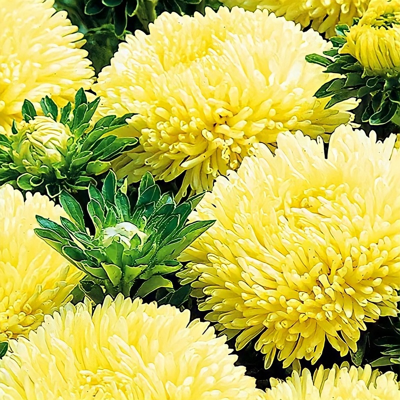 Легендарная серия астр Balloon (Воздушный шар) превосходит все известные сорта по степени махровости и плотности шаровидных соцветий. Растение пирамидальной формы, высотой 50-60 см с прочными цветоносами. На одном растении формируется до 6-8 соцветий изумительного ванильно-желтого оттенка, диаметром 9-13 см.