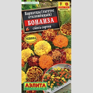 Бархатцы Бонанза F1 американской селекции – абсолютный лидер продаж! Смесь включает очень яркие оттенки. Самые крупные цветки среди отклоненных бархатцев –  диаметром 5-8 см! Цветение обильное и продолжительное. Кустики высотой 25-30 см, ветвистые и плотные. За счет биологических особенностей вида, растения отпугивают нематод, муравьев и белых мух. Поэтому рекомендуется применять смесь для декоративного оформления плодовых садов, групп с пряными травами и низкорослыми овощными культурами, а также в качестве бордюрных растений вдоль дорожек и водоемов. Бархатцы Бонанза станут поистине красочным украшением вашего балкона.