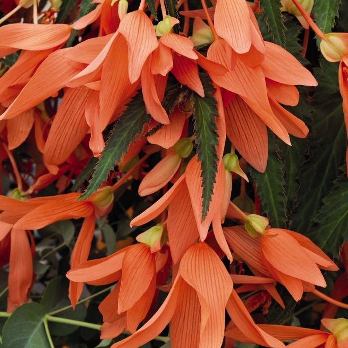 Эксклюзивный гибрид с ампельным габитусом. Пластичен к интенсивности освещения – в отличие от других клубневых бегоний, отлично цветет на ярком солнце. Листьев практически не видно за лавиной ярких цветков Ø 6-7 см. До высоты 35 см растения имеют прямостоячую форму, потом интенсивно кустятся и образуют каскады в вазонах или ковры на клумбах. Гибрид хорошо адаптирован к засухе и не страдает от дождей. Зацветает через 14-15 недель от всходов.