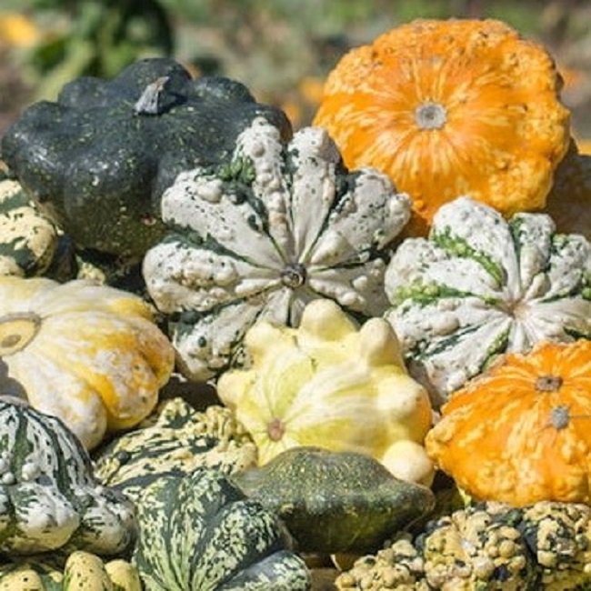 Вашему вниманию предлагается оригинальная смесь декоративных патиссонов. Растения среднеплетистые. Плоды разнообразной формы и окраски. Среди них могут быть бело-кремовые с радиальными жёлтыми полосами, белые в тёмно-зелёных крапинках с радиальными тёмно-зелёными полосами, а также белые с радиальными светло-зелёными полосами. Масса зрелых плодов до 2 кг. Мякоть белая, плотная, отличного вкуса. Используется для домашней кулинарии и консервирования. Молодые плоды богаты аскорбиновой кислотой. Отличается высокой урожайностью и устойчивостью к ложной мучнистой росе.