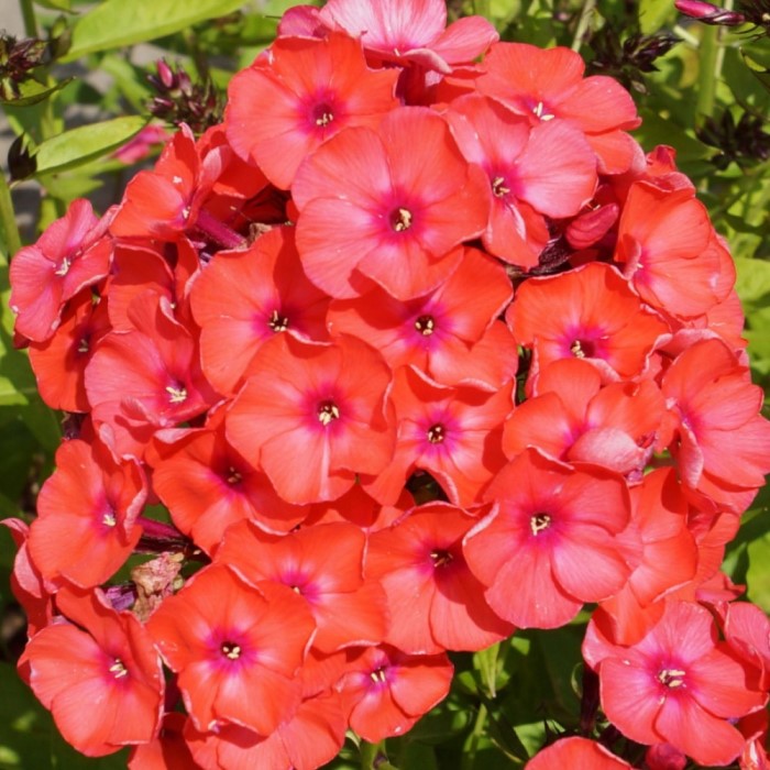 Название: от греческого слова ‘phlox’ — пламя и дано растениям за яркие красные цветки некоторых видов. Однолетнее, сильноветвящееся растение, высотой 25-40 см. Цветки душистые, яркие, лососево-персикового цвета, 3-4 см в диаметре, собраны в щитковидные соцветия. Предпочитает солнечное место, с рыхлыми, плодородными почвами. Используется для срезки, посадки в цветники, на клумбы, рабатки. Хорошо сочетается с рудбекией, кореопсисом.