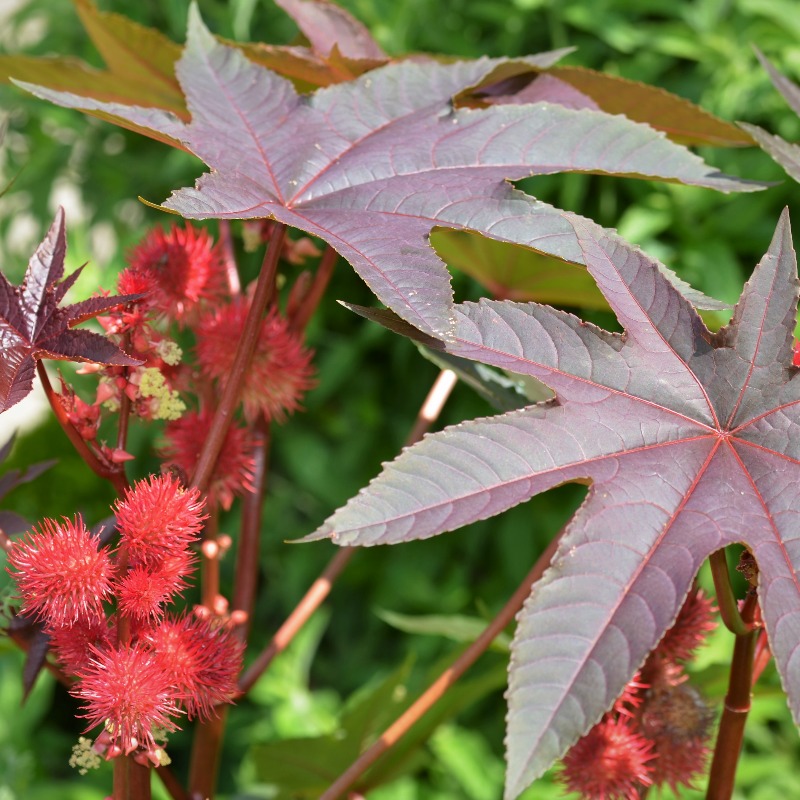 Многолетнее растение, выращиваемое как декоративно-лиственное, однолетнее. Кусты сравнительно широкие, раскидистые, до 250 см высотой. Стебли прямостоячие, разветвленные, голые. Листья расположены в очередном порядке, крупные, зеленые с красными прожилками, на длинных полых черешках, пальчато-раздельныe. Цветки невзрачные, декоративной ценности не имеют, собраны в кистевидные, довольно густые соцветия. Используется для создания небольших групп, одиночных посадок и как фон для красивоцвeтущих растений.