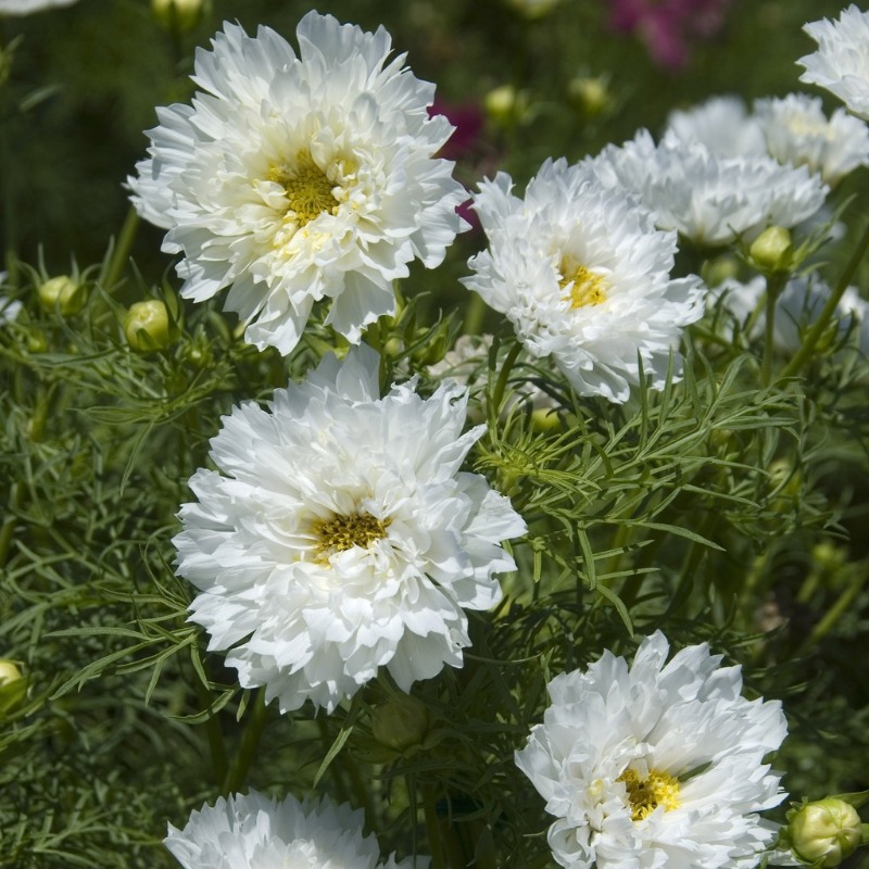 Этот великолепный сорт космеи порадует Вас своим продолжительным цветением, а роскошные махровые корзинки-соцветия, парящие над пышной ажурной листвой, не оставят Вас равнодушными. Растение холодостойкое и неприхотливое в выращивании, формирует ветвящийся от середины куст высотой до 100см и диаметром около 50см. Махровые воздушные соцветия-корзинки белой окраски с желтым центром достигают 10см в диаметре. Используют для декорирования заднего плана рабаток, в сборных цветниках, в качестве ширмы для обрамления мест отдыха. Срезанные в стадии полуроспуска и помещенные затем в вазу цветы долго сохраняют декоративность.