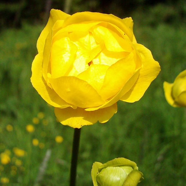Травянистое многолетнее растение. В зависимости от условий обитания его высота варьирует от 20 см до 1 м (при культивировании в благоприятных условиях). Листья у этого растения двух типов: стеблевые и прикорневые. Стеблевые листья располагаются в верхней трети цветоносного побега. Прикорневые собраны в розетку у основания стебля и имеютпальчатораздельную форму. Цветки крупные шаровидные, слегка ароматные, до 5см диаметром, с 10-20 чашелистиками. Их цвет варьирует от бледно-желтого до золотисто-желтого. Лепестки по размеру не превышают чашелистики, но имеют более интенсивную оранжевую окраску. Два вида листьев расположены у черешков и на стеблях. Черешковые рассеченные, собранные в розетки. Стеблевые сидячие, маленькие и очередные. Растение имеет привлекательные крупные цветки огненно-желтого цвета. Они напоминают шар и достигают 6 см в диаметре. Лепестки имеют овальную форму. Они довольно широкие. Всего их от 10 до 20 штук. Растение привлекает приятным, но ненавязчивым ароматом. Цветет растение до середины или конца июня. Но если погода не жаркая, цветение может длиться дольше. В начале июля появляются плоды. Они выглядят как листовки с маленькими носиками, торчащими внутрь.