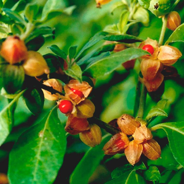 Многолетнее растение из семейства паслёновых. Не очень холодостойкое, но может выращиваться как однолетник, цветущий и плодоносящий в первый же год после посадки (в таком случае выращивается сначала рассада). Представляет собой вечнозелёный кустарник высотой до 1 м и шириной до 0,5 м. Предпочитает хорошо дренированные почвы, но в целом к составу и кислотности почв нетребовательна. Также отлично подходит для комнатного выращивания. При выращивании дома Ашваганда будет цвести несколько раз в год. В лечебных целях применяются плоды, корни, листья и кора. Несмотря на то, что все части растения полезны, корень ашваганды является кладезем полезных веществ! Именно по этому он является универсальным средством борьбы со многими заболеваниями. Для домашнего применения можно использовать листья и веточки, добавляя их в чай. В них содержатся те же вещества, что и в корне, но только в меньшем количестве.