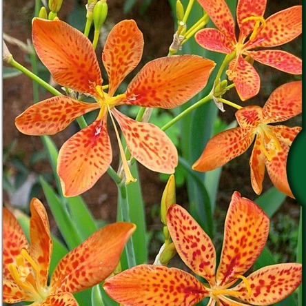Многолетнее растение. Необычное, редкое в садах растение, находящееся на грани исчезновения. Эффектные, орхидее подобные цветки, красно-золотистого цвета с пурпурными пятнами, диаметром 5 см. Куст с мечевидными листьями напоминает куст ириса, высотой 100-110 см. Рекомендуется выращивать на тенистых участках. Используется для оформления многолетних клумб, особенно эффектны у водоемов.