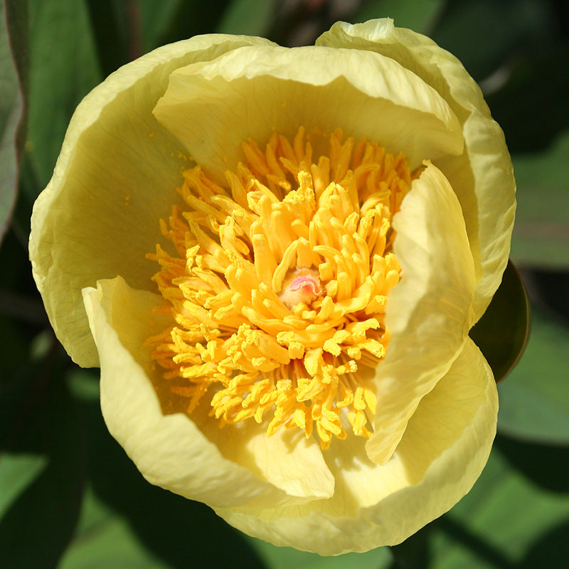 Прекрасное редкое многолетнее растение высотой 70-100 см. Растет пышным плотным кустом, имеет крупные цветки (до 12 см) светло- или ярко-жёлтой окраски. Ранней весной притягивают взгляд яркие розовато-бронзовые почки и молодые листики, которые со временем становятся серо-зелёными. Поздней весной раскрываются его крупные бутоны, превращаясь в полупрозрачные цветки-чаши прохладного лимонно-жёлтого цвета, наполненные золотыми тычинками. В период цветения красота пиона действительно поражает воображение.