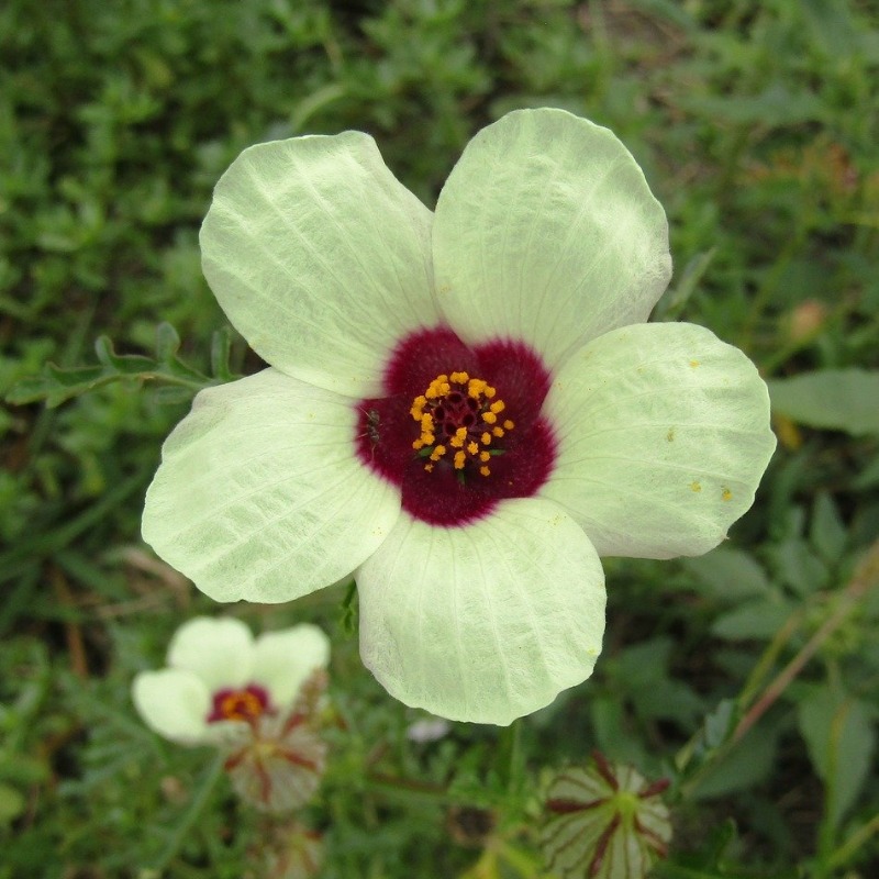 Гибискус тройчатый или гибискус северный — скромный однолетник, относящийся к многочисленному семейству Мальвовые. Цветки гибискуса раскрываются в утреннее время всего на несколько часов, а после полудня уже закрываются. Цветет растение обильно все лето до самых морозов, до тех пор, пока температура воздуха не опустится до нуля. Его можно посадить вместе с однолетниками, которые зацветают вечером, хотя гибискус наряден и без цветков, у него зелень блестящая сочно-зеленого цвета. Цветки у гибискуса бледно-желтого цвета с пурпурным зевом, на фоне которого красиво выделяются желтые тычинки и хотя они не такие роскошные и яркие, как у других видов гибискуса, они с легкостью украсят любой сад. Листья у садового гибискуса резные, стебель стелющийся. Очень жалко, что он редко встречается в цветниках любителей цветоводов, однако он красавец, внимание соседей и гостей непременно привлечет. После увядания цветков формируется плод оригинальной шарообразной формы, эти вздутые плоды очень декоративны, их используют в высушенном виде для зимних букетов. Гибискус тройчатый ценится как лекарственное растение, является неплохим медоносом.