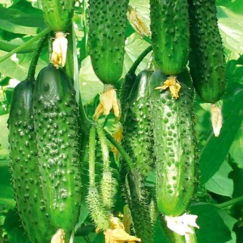 Скороспелый, партенокарпический, пучковый гибрид корнишонного типа для открытого грунта, тоннелей, весенних теплиц, с «букетным» расположением завязей. Зеленцы бугорчатые, белошипые, интенсивно-зелёной окраски, без белёсости, овально-цилиндрической формы, длиной 11-13 см, с часто-средним опушением, хрустящие, очень ароматные. Засолочные, консервные и вкусовые качества высокие. Плоды до 10 дней сохраняют товарные качества в нерегулируемых условиях. Обладает высокой устойчивостью к комплексу заболеваний (настоящая и ложная мучнистые росы, корневые гнили). Выделяется обилием зеленцов на растении, дружным начальным плодоношением, длительной массированной отдачей урожая, что позволят получить большой урожай свежих огурчиков в начале лета, когда их цена на рынке еще очень высока. Жаростойкий, в засушливое лето гарантированно обеспечит большим количеством вкусных зеленцов! Нужно обратить внимание на то, что у гибрида букетный тип разположения завязи и "придерживать" зеленцы на растении не следует, так как при регулярных сборах большое количество завязей трогается в рост и, соответственно, урожай будет выше. Пучковые гибриды лучше формировать в строго один стебель. В этом случае листья главного стебля хорошо освещаются, а завязи получают достаточно питательных веществ. Ослепляются нижние 3-4 узла, а далее до самой шпалеры все побеги удаляются. На главном стебле в каждом узле остается один лист и пучок огурчиков. Когда главный стебель отдаст первый урожай, растение подкармливают азотным удобрением, и в пазухах листьев вновь начнут развиваться новые огурчики. Необходимо высаживать огурцы редко, не более двух растений на 1 кв.м. Также необходим обильный полив и ежедневный сбор урожая. При такой агротехнике урожайность достигнет 40 кг/м2 за сезон, при этом с каждого растения можно получить до 400 огурчиков.