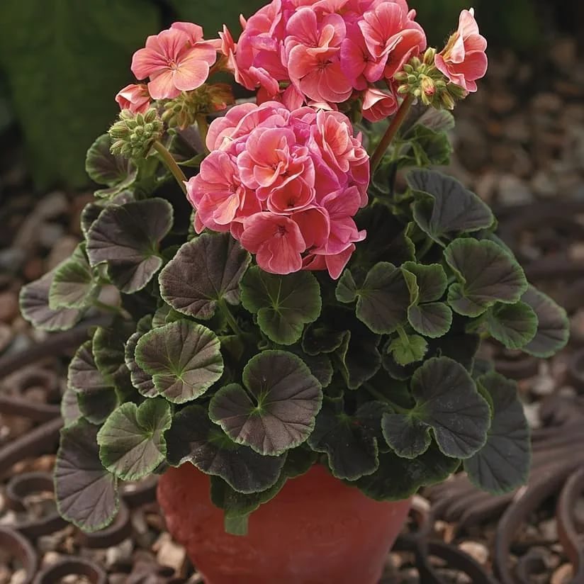Уникальная окраска листьев. Крупные шаровидные соцветия диаметром до 15 см. Использование – вазоны, горшки, клумбы.Профессиональная пеларгония с листьями шоколадного цвета и зеленой каймой по краю. На их фоне особенно ярко смотрятся шаровидные соцветия различной окраски. Отличается повышенной однородностью и необыкновенной обильностью цветения. Прекрасное решение для комбинированных вазонов и композиций.Прорастание: 15-18 дней при 20-22°СРассада: 7-8 недель при 16-18°СНачало цветения: через 10-12 недель после пикировки.Растение высотой 30-35 см, цветы собраны в плотные соцветия, красивые круглые листья с сильно-волнистым краем.