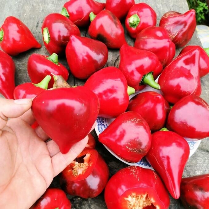 Один из самых сладких и вкусных сортов перца. Раннеспелый (105-110 дней) урожайный сорт с необычайно красивыми и очень сладкими плодами. Растение невысокое, компактное (40-60 см). Плоды сердцевидно-конусовидной формы массой 150-200 г, с острым носиком, тёмно-красного цвета. Растения высокоурожайные, каждый кустик способен дать до 35 плодов при соответствующем уходе. Сорт неприхотливый, устойчив к болезням. Мякоть сочная, хрустящая, очень сладкая. Стенки плода толстые, мясистые, толщиной 9-12 мм. Лежкость высокая, перцы не подвергаются гниению. Прекрасно подходит для фаршировки и всех видов консервирования.