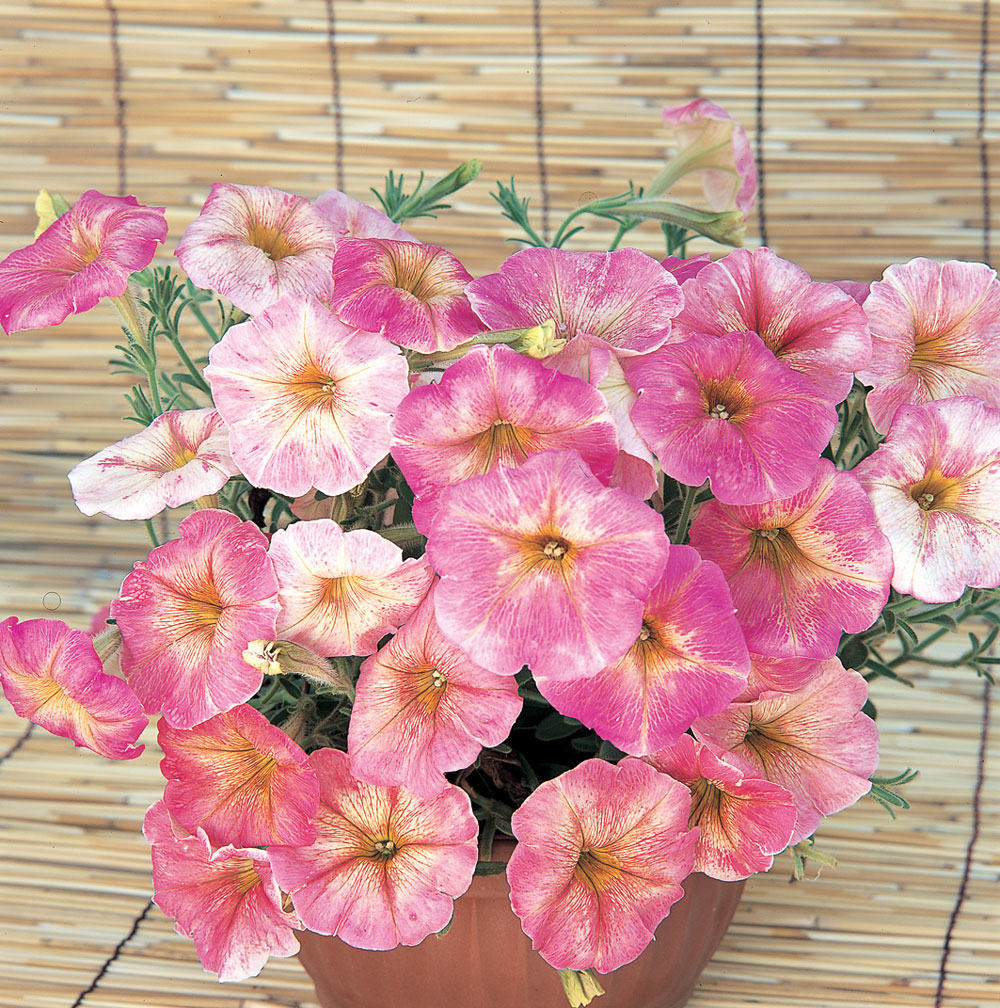 Растение мощное высотой до 40 см. Цветы крупные, перламутрово-розовые, с жилками. Цветение обильное с июня до осенних заморозков. Прекрасно подходит для клумб, рабаток.
