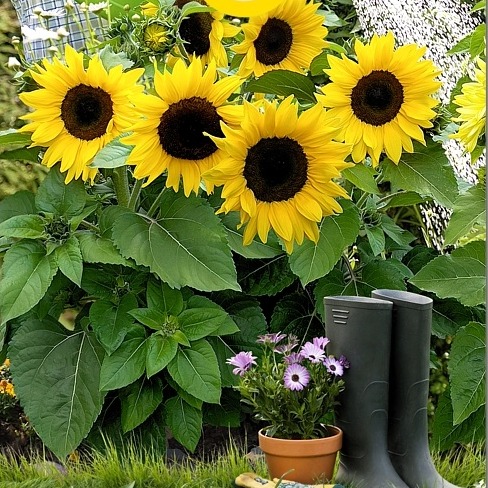 Специальная селекция, направленная для достижения непрерывного цветения в течении всего сезона. Это факультативные растения длинного дня, что позволяет делать поздние посевы даже летом и получать прекрасное цветение. Растение сильное, плотно собранное, высотой 40-70 см. Диаметр соцветия на основном стебле 16-18 см - не отличается от размеров цветков на боковых побегах. На одном растении раскрыты сразу несколько соцветий. Соцветие необычное – лепестки короны длинные, темный центр небольшого диаметра. Лепестки соцветий имеют ярко-желтый цвет на фоне черно-коричневой середины. Холодостойкое, прекрасно переносит весенние перепады температур и осенние холода. Гибрид устойчив ко многим самым вредоносным штаммам ложной мучнистой росы, являющихся большой проблемой для садовых подсолнухов. Очень хорошо подходит для выращивания на клумбах, особенно в групповых посадках. Эффектно смотрится в контейнерах. Дает прекрасную, долго стоящую в вазе, срезку.
