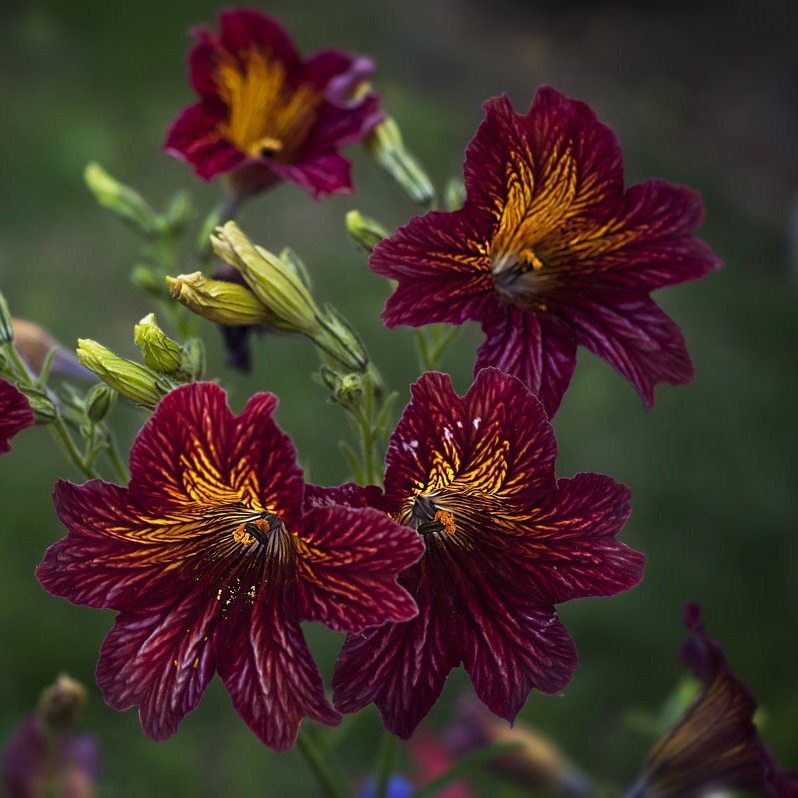 Необыкновенный летник иностранной селекции из семейства Пасленовых. Кустик густой и ветвистый, с прямостоячими побегами высотой около 40-45 см. Цветки крупные, бархатистой фактуры, диаметром 4-5 см. Обильно распускаются с июня по сентябрь. Их пестрая окраска с удивительными переливами кофейных, бронзовых, золотистых оттенков и выразительным сетчатым жилкованием венчиков однозначно не останется без внимания садовода. Сальпиглоссис – оригинальное срезочное растение, украшение каждого цветочного букета. Широко применяется для групповой высадки в центральные клумбы и придомовые вазоны.