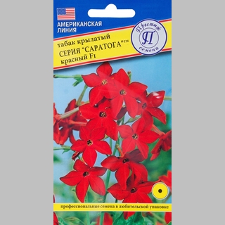 Однолетнее растение. Серия "Саратога" представляет собой карликовую форму крылатого табака, высотой 25-30 см, шириной 25-30 см. Листья широкие, покрыты жилистыми волосками. Цветки воронковидные, крупные, до 5-8 см в диаметре, ароматные, собраны в рыхлые метельчатые соцветия. Цветки открываются к вечеру или в пасмурную погоду. Используют табак для групповых посадок, миксбордеров, рабаток, красиво смотрится в керамических вазах. Табак особенно хорош для затенённых балконов (северной и северо-западной ориентации). Переносит соседство низкорослых растений: петунии, лобелии или агератума, сочетается с сальвией.