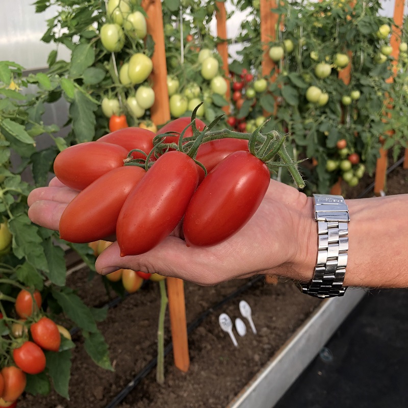 Суперраннеспелый, детерминантный гибрид. Посадив его, вы точно не останетесь без урожая! Высота растений около 120 см. От всходов до начала плодоношения проходит около 85-90 дней. Первое соцветие закладывается над 6-7 листом, последующие через 1-2 листа. Кисти простые с 7-8 плодами цилиндрической формы с изящным носиком. Томаты массой 45-50 г имеют насыщенный красный цвет. Стенки плодов средней толщины, семенных камер 2 и они хорошо заполнены. Мякоть приятной консистенции, с легкой кислинкой. Это, пожалуй, самый вкусный томат из раннеспелых. Томаты долго висят на кусте, что позволяет производить сбор целыми кистями.