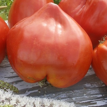 Мощный, прекрасный среднеспелый сорт с крупными плодами! Растение индетерминантное, достигает 2 м в высоту, имеет мощные и крепкие стебли с сильными побегами. Плоды впечатляют своими размерами и ярким красным цветом. Они напоминают эффектные сердца, часто со сложными изгибами, приплюснутые и рифлёные, с вытянутым носиком. Вес плодов варьируется от 300 до 500 г, но часто достигают 1 кг! Мякоть помидоров маслянистая, плотная и малосочная. В ней содержится небольшое количество мелких семян. Вкус сладковатый с пряными нотками. Этот сорт отличается высокой урожайностью и хорошей адаптацией к различным погодным условиям. Он будет радовать вас своими плодами до поздней осени. Требует подвязки к опоре.