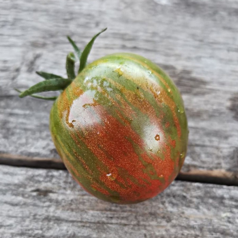 Детерминантный штамбовый куст от 80 см и выше метра при избыточной влажности и загущённости. Среднеспелый, в норме созревает через 105-115 дней. Плоды имеют 2-3 камеры, красно-коричневые в полоску, массой от 50 до 100 г, толстые стенки перикарпия, вкусные, сладкие с насыщенным вкусом. Неплохо хранится. Благодаря универсальности плоды пригодны для любых заготовок на зиму.