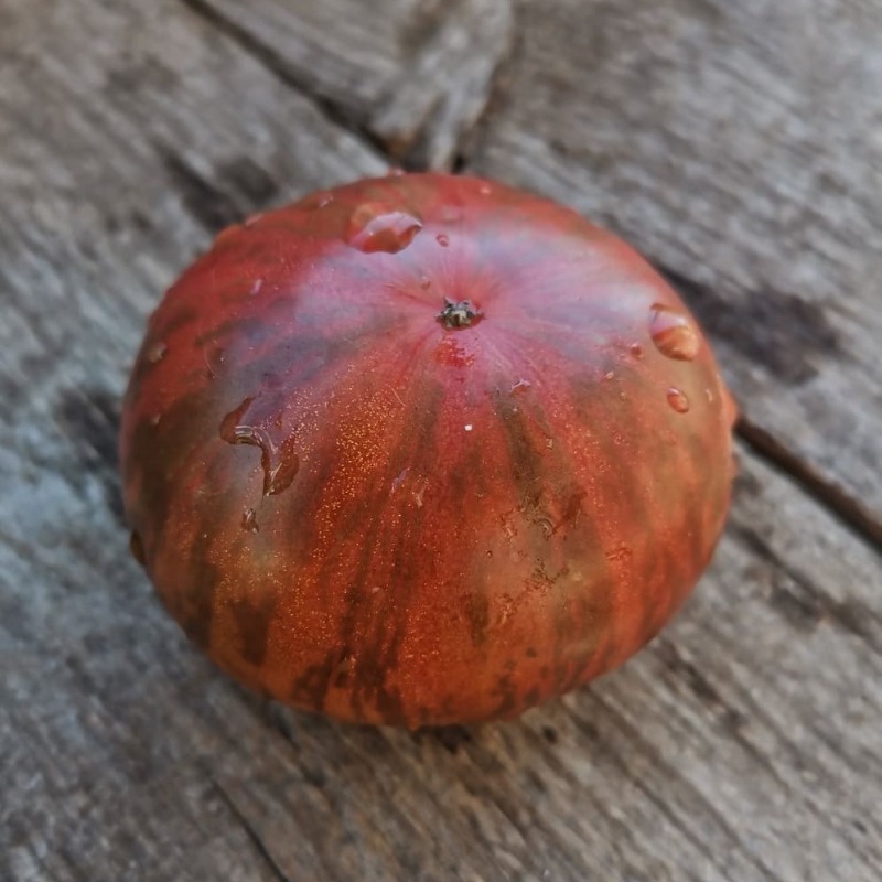 Детерминантный штамбовый куст в норме около 70 см; выше метра при избыточной влажности и загущённости. Лист крупный, морщинистый, цельный. Среднеспелый, в норме созревает через 105-115 дней. Завязываемость отличная. Плоды крупные, плоскоокруглые, шоколадные с полосками, 200-300 г., не только красивые, но и мясистые, сочные, сладкие, с фруктовыми нотками. Очень вкусные салаты, соки, а так же любые заготовки на зиму.