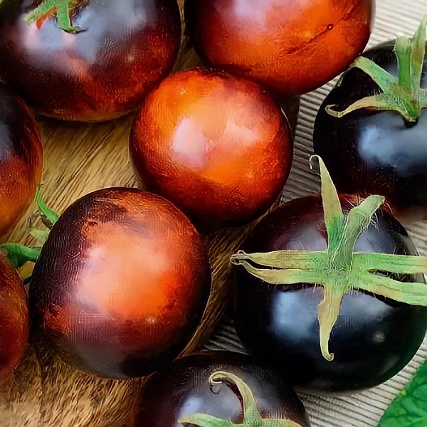 Необыкновенный цвет. Фруктовый вкус. Эксклюзивный раннеспелый гибрид (от всходов до созревания 95-100 дней), отличающийся нестандартной двухцветной окраской плодов. Урожайный, обладает приятными вкусовыми качествами и высокой декоративностью. Рекомендуется для  выращивания в теплицах и открытом грунте. Растение  с укороченными междоузлиями, высотой 1,5-2 м. Кисть простая, состоит из 7-10 плодов. Томаты округлые, гладкие, глянцевые, массой 40-50 г, по мере созревания приобретают насыщенный черно-фиолетовый  оттенок с  кремовыми сегментами. Мякоть плотная, вишнево-красного цвета, с сильным ароматом и необыкновенным фруктовым вкусом с отличным соотношением сахаров и кислот. Богата антоцианами, выполняющими функции природного антиоксиданта. Урожайность 8-10кг/м2.