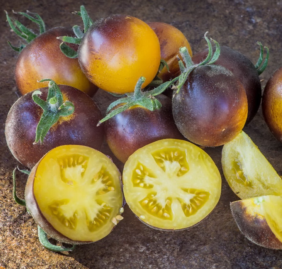 Редкий и красивый сорт с отличным вкусом! Детерминантный, среднеспелый, экзотический сорт с опушёнными голубыми листьями и стеблями. Плоды густо-фиолетовые у плодоножки, при полном созревании ярко-жёлтые с фиолетовым муаром. Повышенное содержание антоциана придаёт плодам эту тёмную окраску. Они не только очень красивы, но и полезны, благодаря присутствию мощного антиоксиданта! Плоды покрыты лёгким опушением, средней массой 60-80 г.