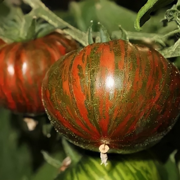 Среднеспелый (110-120 дней) сорт салатного назначения для парников и теплиц. Растение индетерминантное, высотой до 2,5 м. Может формироваться в один или два стебля. В кисти до 5 плодов. Плоды плоскоокруглые крупные, ребристые, массой 280-400 г, отдельные плоды до 600 г, оригинальной окраски: незрелые - зеленые с темно-зелеными полосками, зрелые - красно-коричневые с блестящими зелеными полосками. Мякоть мясистая, сочная, ароматная, имеет неповторимый сладкий вкус с легкой томатной кислинкой. Урожайность 9-11 кг/м2.