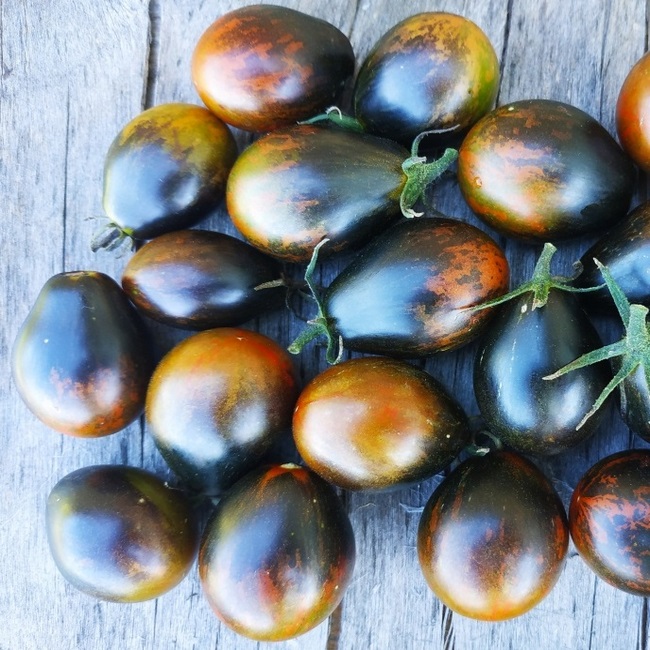 Происхождение сорта не известно. Среднеспелый индетерминантный сорт, плодоносящий лучше в ОГ, чем в теплице. Высота до 2 м, идеально выращивать в три ствола, предоставив достаточно места. Плоды сначала темно-фиолетовые, почти черные (чем больше солнца, тем темнее), выглядят потрясающе! По мере поспевания немного светлеют, становясь бордово-коричневые, с полосами или штрихами. Шкурка плотная, но не грубая, плоды не растрскиваются, а мякость сочная, с фруктовыми нотками при полной спелости (просто дайте им хорошо дозреть). Хороши для свежего потребления, в различных салатах целиком, для мариновки (в сочетании с желтыми черри выглядят очень празднично), и конечно, для заморозки.