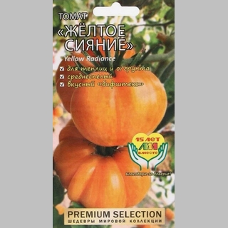 Жёлтое сияние (Yellow Radiance) Сорт от Брэда Гейтса (США). Среднеспелый, индетерминантный суперурожайный сорт (75-100 дней). Плоды желтые с зелеными полосами, которые при созревании становятся золотистыми, плоскоокруглые, иногда с ребрышками. Мякоть мягкая, с ароматом помидоров с легким оттенком цитрусовых и богатым насыщенным вкусом. Несмотря на относительно тонкую шкурку, плоды на всём протяжении сезона без трещин. Масса плодов 200 – 600 г. Густые кусты высотой до 1,8 м, с большими листьями, которые укрывают плоды от солнца. Куст можно выращивать в 1-2 стебля, плодоношение растянутое. предпочтительно хорошо освещенное место. Для салатов, соков.