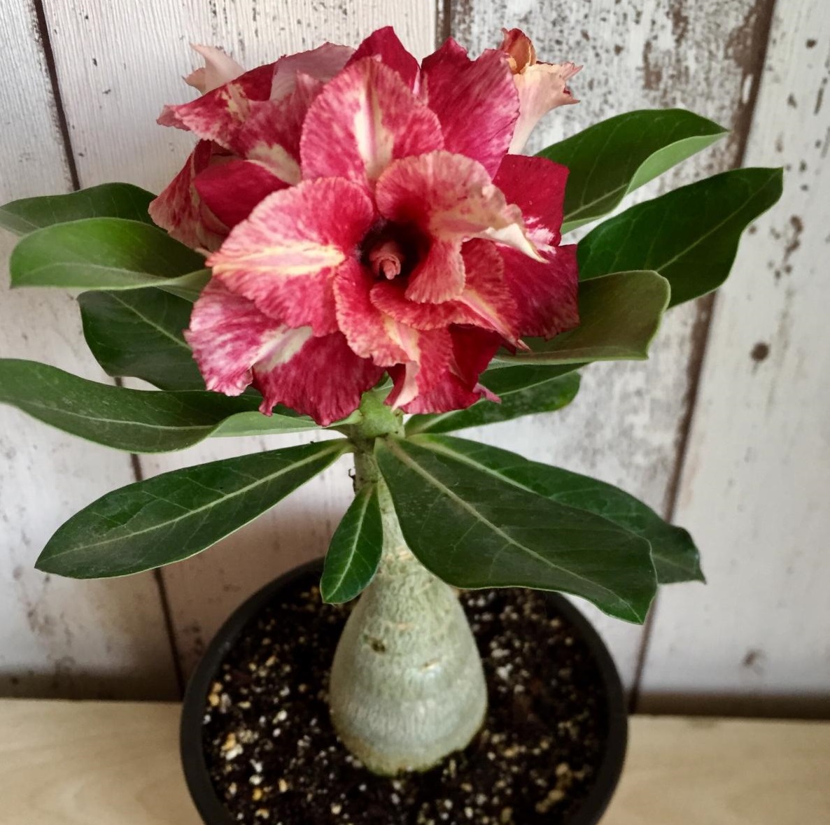 Адениум или роза пустыни, относится к семейству Кутровых и к древесным суккулентам – растениям, которые накапливают воду в «частях тела».  Этот многолетний кустарник родом из тропической Африки. Красивоцветущее растение с очень толстым стволом, утолщённым в прикорневой части, по форме напоминающим бутылку. В домашних условиях в высоту достигает 50-70 см, в ширину может достигнуть 30-40 см Листья глянцевые, серо-зелёного цвета, кожистые. Форма ланцетная, длина до 7 см. Интересно: при семенном способе выращивания, потомство не на 100 % наследует признаки родительского растения.