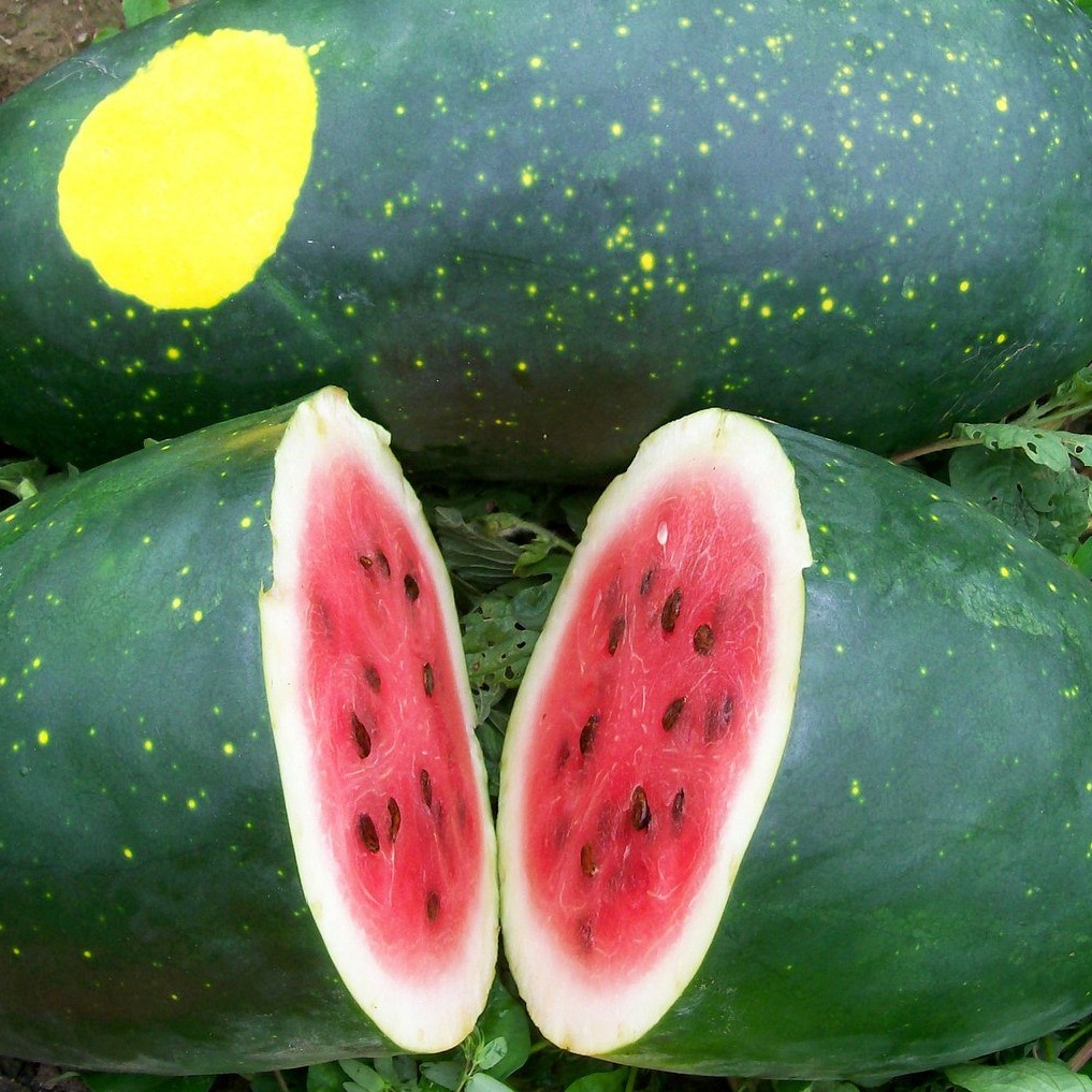 Нежная, очень сладкая мякоть. Очень декоративен. Среднеспелый сорт. Период от полных всходов до первого сбора плодов 85-90 дней. Растение плетистое с крупными плодами массой до 12 кг, цилиндрической формы и необычным рисунком коры. На тёмно-зелёном фоне размещено одно крупное жёлтое пятно и множество мелких жёлтых пятен. Мелкие ярко жёлтые пятна присутствуют и на листьях, что делает растения арбуза весьма декоративными. Мякоть красная, нежная, очень сладкая. Сорт засухоустойчивый.