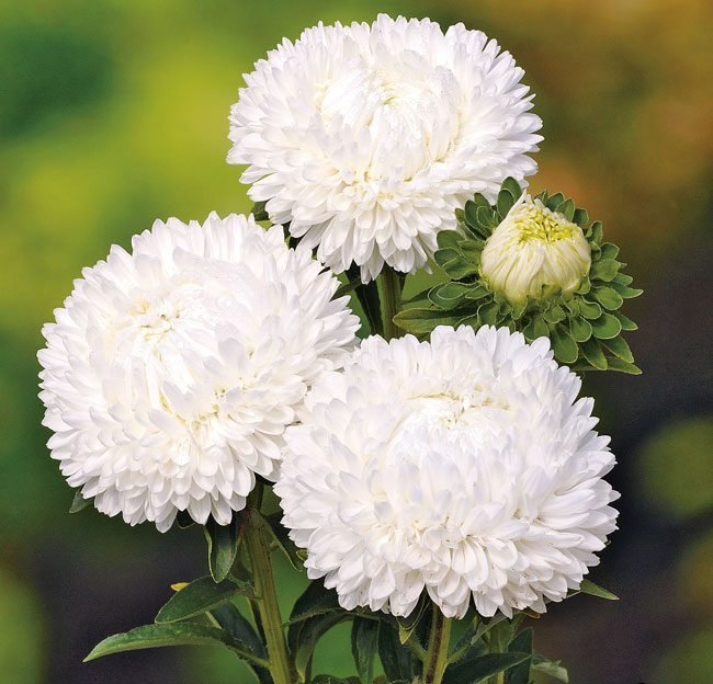 Густомахровые соцветия устойчивы к проникновению дождя. Растение высотой 50-60 см. Соцветия прочные, шаровидные, диаметром 9-13 см белого цвета. Цветет обильно с июля до морозов. Используют в сборных цветниках, на рабатках, для срезки.