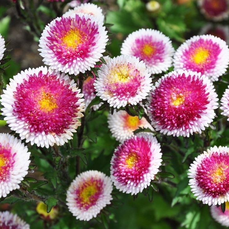 Эта астра с махровыми цветками оригинальной окраски по праву станет изысканным украшением Вашего сада. Образует куст высотой до 50см. Стебли крепкие, прямые. Соцветия полусферические, красно-малинового цвета с интенсивным переходом в белый цвет на язычковых цветках, небольших размеров (до 5см в диаметре). Цветет в июле – сентябре. Отличается обильностью и продолжительностью цветения. Подходит для посадки в высоком бордюре, на смешанной клумбе или в групповых посадках на газоне. Также отлично смотрится при солитерных посадках, а в срезке она просто восхитительна!