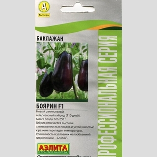 Отличный новый отечественный гибрид баклажана для пленочных укрытий. Раннеспелый (от всходов до плодоношения 110 дней). Растение высокое. Гибрид отличается высокой завязываемостью плодов и устойчивостью к резким перепадам температуры. Плод грушевидный, длиной до 25 см, диаметром 7-9 см, темно-фиолетовый с сильным глянцем, массой в среднем 250 г. Мякоть белая, отличного вкуса. Урожайность 6,5 кг/м2. Рекомендуется для домашней кулинарии и консервирования.