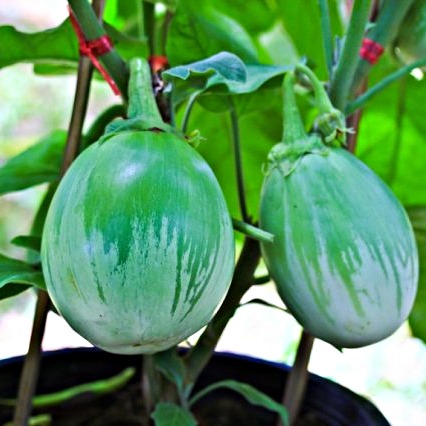 Раннеспелый сорт с двухцветными яйцевидными плодами* массой около 40 г. Особую декоративность растениям придают крупные сиреневые цветки, собранные в кисти, а также волнистая кромка бархатных изумрудных листьев. Компактные кустики обильно плодоносят в горшечной культуре. Могут выращиваться в открытом грунте и теплицах. Чтобы получить более крупные баклажаны, следует нормировать число завязей в кистях.