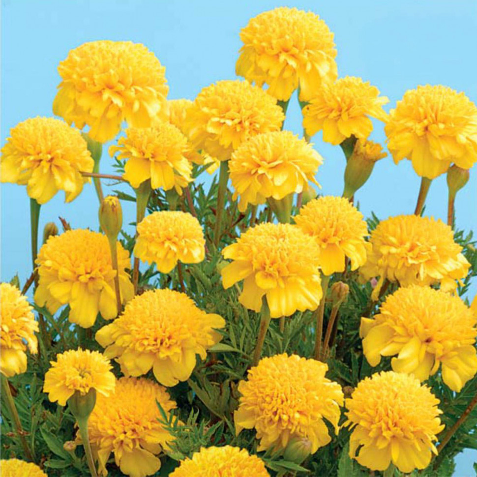 Нарядная серия невысоких бархатцев для оформления бордюров, рабаток, вазонов и балконных ящиков. Образует ветвистый кустик высотой 20 см. Соцветия диаметром 4-5 см, желтого цвета. Цветет с июня до заморозков. Бархатцы светолюбивы и теплолюбивы, заморозков не переносят, к почвам нетребовательны, но предпочитают плодородные легкие почвы.