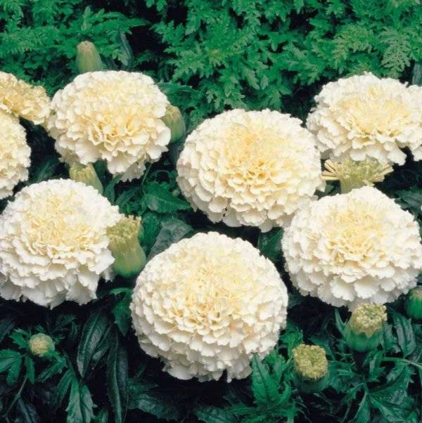 Сорт с необычной, ванильно-белой окраской соцветий. Формирует низкорослые, компактные кусты высотой 30-35 см. Соцветия густомахровые, крупные – Ø5-7 см. Цветение раннее, обильное и продолжительное. Растения неприхотливые, светолюбивые и относительно засухоустойчивые. Используются на клумбах и в рабатках, в бордюрах вдоль дорожек. Хорошо растут в ограниченном объеме грунта, пригодны для выращивания в балконных ящиках и садовых контейнерах.Посев. Выращивают рассадным способом. В фазе одного-двух настоящих листьев сеянцы пикируют. Рассаду высаживают в открытый грунт, когда минует опасность заморозков. Растениям необходимы регулярные поливы, прополки, рыхления и подкормки. Возможен посев семян в открытый грунт на глубину 1 см.