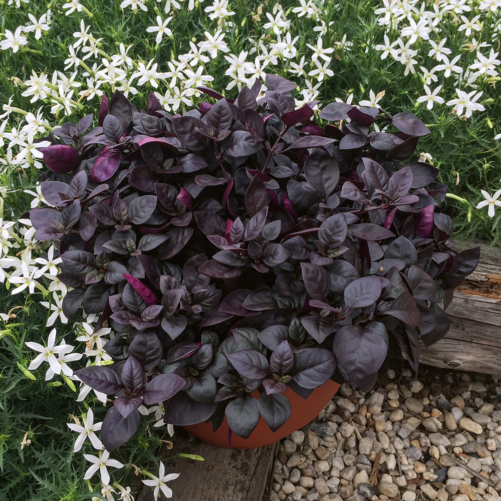 Уникальный сорт с эффектным внешним видом. Очень ароматный и приятный на вкус. Плотные компактные кустики отличаются небольшими размерами (Ø 25-35 см) и насыщенным пурпурным цветом. При затенении часть листьев становится зеленой, что придает растениям еще большей изысканности.