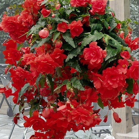 Превосходная серия ампельной бегонии – сочетает плотность растения с обильным и продолжительным цветением! Растение мощное, формирует поникающие побеги длиной до 80 см. Цветки очень крупные – 10-12 см в диаметре. Взрослое растение достигает в диаметре 0,8-1,0 м. Предпочитают солнечные места и полутень. Слабо повреждаются осадками!