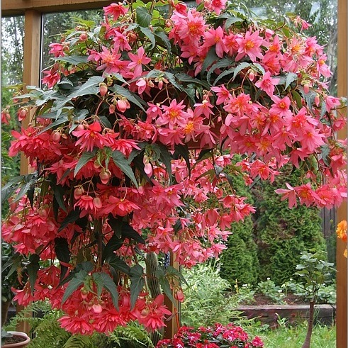 Эффектная гигантская ампельная бегония. На мощных побегах длиной до 1,2 м постоянно образуются впечатляющие соцветия. Новая, легкая в выращивании, каскадная бегония. Невероятно красивые цветки – густомахровые с заостренными звездчатыми лепестками, плотные, ярко-розовой окраски. Обладает природной высокой всхожестью семян, сохраняющейся продолжительное время. Этот вид выращивается значительно легче других бегоний. Важное достоинство бегонии Фанки Пинк – цветущие растения практически не повреждаются дождем! Растение прекрасно выглядит на открытом воздухе, как в полутени, так и на солнце. Обладает очень длительным непрерывным цветением – с июня до заморозков.