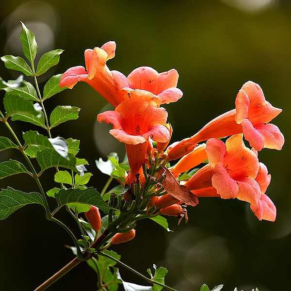 Кампсис укореняющийся, или Текома укореняющаяся — крупная многолетняя листопадная древеснеющая лиана родом из Северной Америки, с многочисленными воздушными корнями на стеблях, с помощью которых, прикрепляясь к опоре, поднимается на высоту до 15 м. Непарноперистые листья до 20 см длиной, из 9-11 листочков, сверху ярко-зеленые, голые,снизу более светлые, сплошь опушенные или только по жилкам. Крупные, трубчато-воронковидные цветки, до 5 см в диаметре и до 9 см длиной, с ярко-оранжевым, трубчатым венчиком и ярко-красным отгибом собраны в верхушечные кисти по 10-15 цветков. Цветение начинается в июне и длится до заморозков. Оно бывает обильным и красочным. Интересно, что на ветвях лианы одновременно есть и бутоны, и цветки, и плоды. Растет быстро, особенно на богатых и умеренно влажных почвах. Светолюбив. Легко переносит обрезку. Теплолюбив, но выдерживает кратковременное понижение температуры до -25°С. Может быть выращен в виде прямостоящего, штамбового дерева.