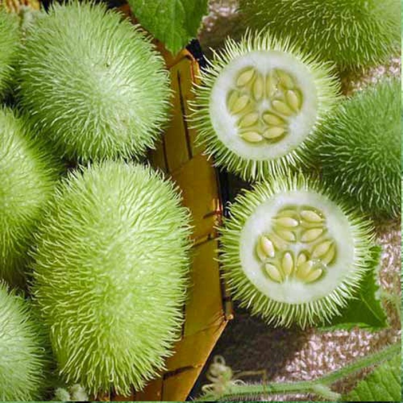 Быстрорастущий, неприхотливый однолетник. Декоративные плоды для зимних композиций. Вьющийся огурец или тыква ворсистая -любопытная разновидность семейства тыквенные родом из северо-восточной тропической Африки с желто-зелеными фруктами, покрытыми плотным слоем мягких спинных хребтов. Но эти симпатичные плоды лишь декоративны, есть их нельзя, их можно высушивать, они долго хранятся и будут красиво смотреться в декоративных цветочных композициях, вместе с декоративными тыковками. Цветение - с августа по октябрь, плоды собирают в сентябре-октябре. Огурец Веселые ёжики - прекрасный неприхотливый сорт для озеленения стен, беседок, пергол, газнов, садовых домиков, железных, сетчатых и каменных оград, а также для выращивания в комнатных условиях.