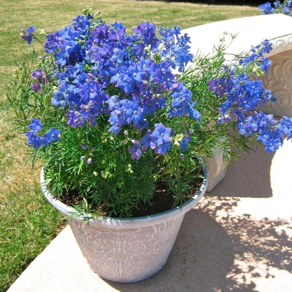 Многолетник, зацветающий в год посева. Генетически компактное сильноветвящееся растение высотой 30-35 см. Цветы тёмно-синей окраски, диаметром до 4 см, собраны в соцветия. Листья зелёные сильно рассечённые. Цветёт обильно с июня по июль, возможно повторное цветение осенью. Великолепно подходит для украшения бордюров, клумб и для посадки в вазоны и контейнеры.