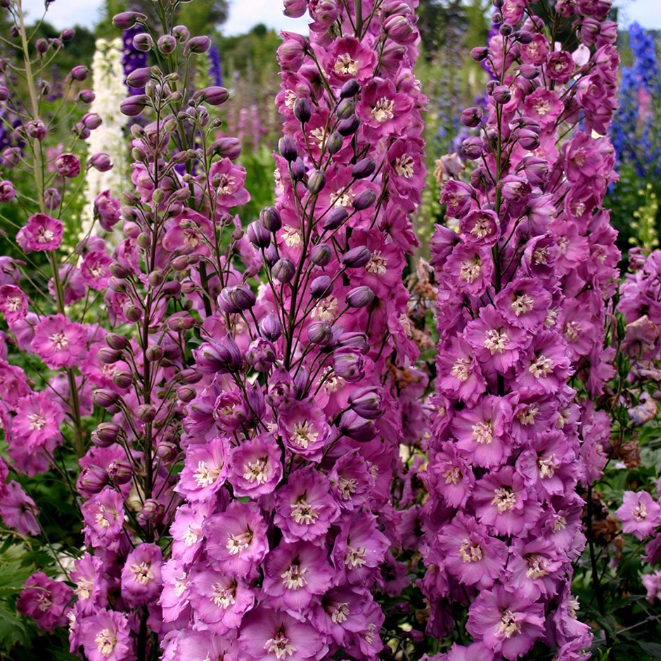 Новозеландские гиганты — признанные мировые законодатели селекционной моды среди дельфиниумов. Исключительные декоративные качества, зимостойкость, долговечность и неприхотливость, сделали эти сорта самым желанным приобретением многих профессионалов и садоводов-любителей. Растения рослые, более 2 м, с прочными здоровыми цветоносами, но все же нуждается в опоре. Необыкновенно крупные цветки розового оттенка с белым глазком, собраны в плотное, буквально набитое соцветие. Первое цветение происходит на второй год после посева, в июне-июле. Повторное — в августе. Дельфиниумы предпочитают солнечные, защищенные от ветра участки с плодородными нейтральными почвами и хорошим дренажем (не выносит переувлажнения).