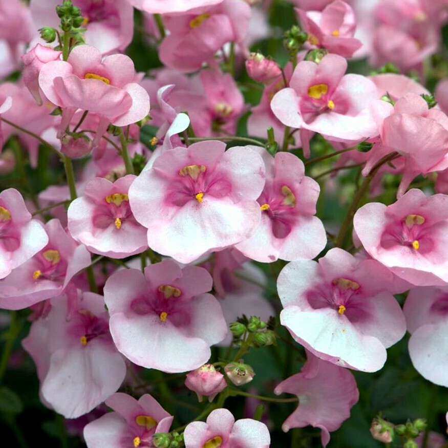 Это изящное ампельное растение сочетает в себе особую декоративность, продолжительное цветение, устойчивость к жаре. Поникающие, ветвистые побеги с мелкими листьями, равномерно разрастаясь, образуют ярко-зеленый покров с нежно-розовыми метельчатыми соцветиями. Цветки мелкие, со шпорцами, диаметром до 2 см.