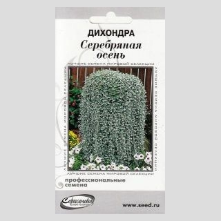Дихондра Серебряная осень - мощное растение с плетистой листвой оттенка чистого серебра. Многолетник, выращиваемый как однолетник. Побеги длиной до 1,8 м. Очень неприхотлива, проявляет завидную устойчивость к капризам погоды и практически не поражается вредителями и болезнями. Используется для подвесных корзин, контейнеров и балконных ящиков.