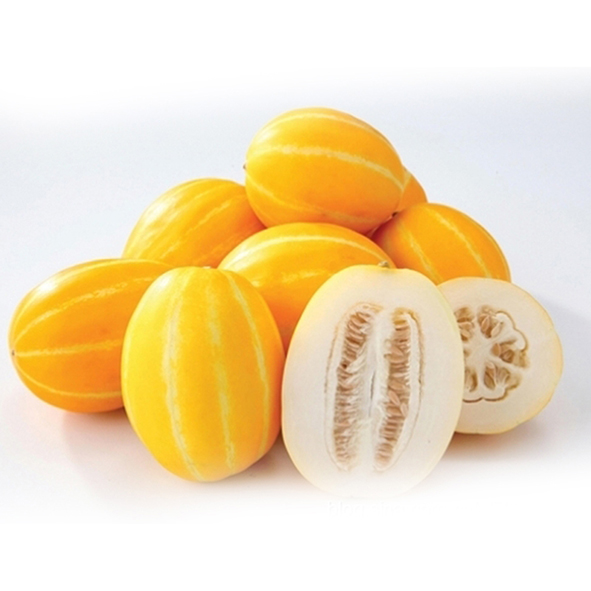 Оригинальные по размеру и форме мини-дыни азиатского типа. Овальные, без сетки, ярко-желтые плоды, разделенные на слабовыраженные сегменты белыми полосами. Очень ранние (60-62 дня) сроки созревания. Размер плода зависит от количества созреваемых на плети и варьируется от 300 до 600 г. Кожура тонкая. Мякоть плотная, белая, хрустящая. Содержание сахаров 14-18%. Можно возделывать и «внахлест», и «шпалерно».
