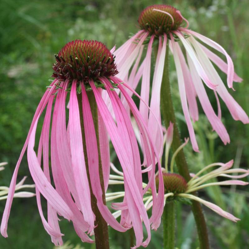 Многолетнее декоративное травянистое растение. Образует куст высотой до 100 см. Листья продолговато-ланцетовидные, простые, цельные, на коротких черешках. Соцветия-корзинки крупные, на длинном прочном цветоносе. Язычковые цветки размером 3-6 см окрашены в розовато-белый цвет и опущены вниз. Трубчатые цветки желто-коричневого цвета собраны на выпуклом цветоложе. Цветет с июля по октябрь. Светолюбива, засухоустойчива, переносит полутень, предпочитает плодородные, достаточно увлажненные, но не сырые почвы.