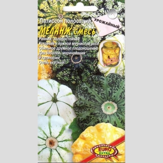 Вашему вниманию предлагается оригинальная смесь декоративных патиссонов. Растения среднеплетистые. Плоды разнообразной формы и окраски. Среди них могут быть бело-кремовые с радиальными жёлтыми полосами, белые в тёмно-зелёных крапинках с радиальными тёмно-зелёными полосами, а также белые с радиальными светло-зелёными полосами. Масса зрелых плодов до 2 кг. Мякоть белая, плотная, отличного вкуса. Используется для домашней кулинарии и консервирования. Молодые плоды богаты аскорбиновой кислотой. Отличается высокой урожайностью и устойчивостью к ложной мучнистой росе.