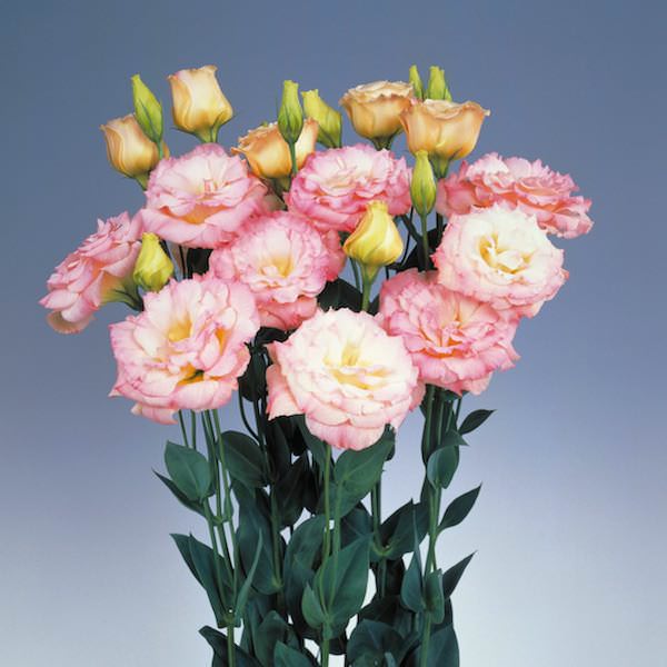 Роскошное и очень нежное однолетнее растение из семейства  Горечавковые. Стебли высотой до 70 см, сильные, прочные, способные выдержать крупные, плотные, махровые цветки. Изысканные оттенки и 100% махровость сделала эту серию фаворитом на рынке срезочных лизиантусов. Довольно крупные (5-6 см) цветки золотисто-бежевого оттенка,  переходящего к краю лепестков в нежно-розовый,  в пору цветения похожи на полуоткрытые бутоны розы, с атласными, спиралевидно расположенными лепестками. Предпочитает солнечные места, окультуренную почву, регулярные поливы и опрыскивания.